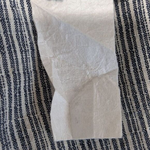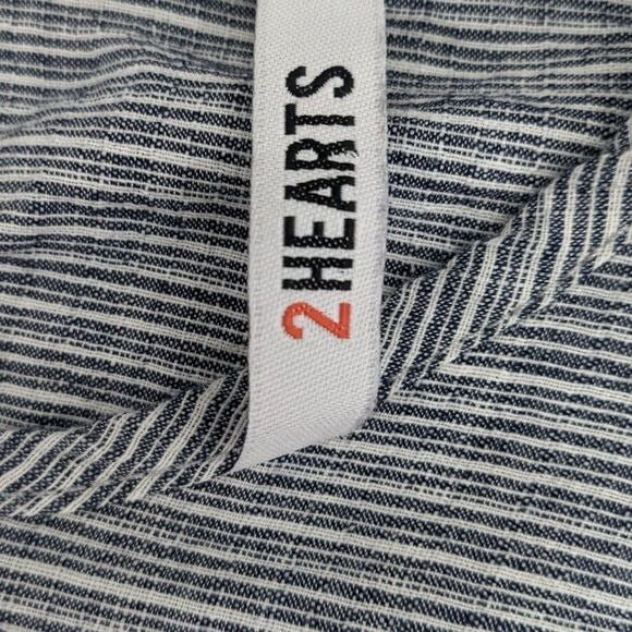 2Hearts boho top features a rounded neckline and long bell style sleeves. Fabric is lightweight with some texture in a navy and white stripe. Tag is faded, but bought as a medium and faint M can be seen on tag. Great condition!
