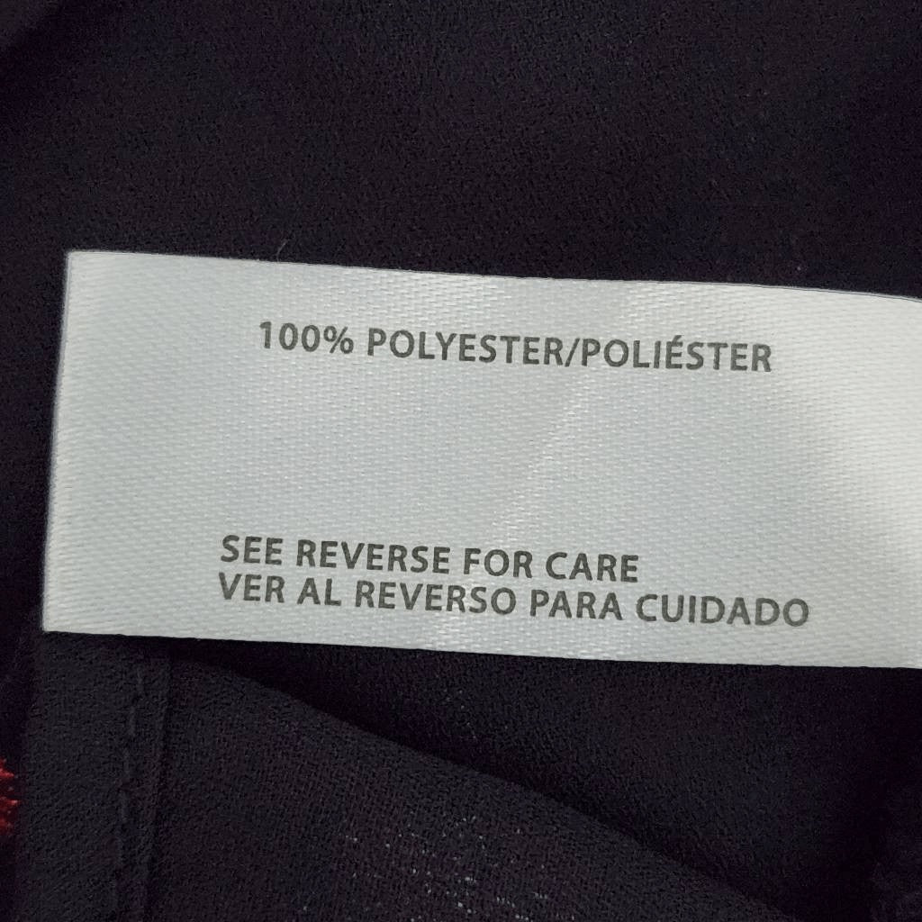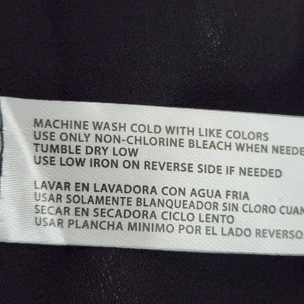 a love story black blouse with metallic red print and tie at the neckline. Sleeves have a cute gathered detail.