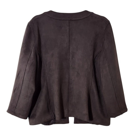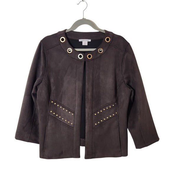 This Allison Daley jacket brings a chic, edgy touch with its soft brown faux suede and front hook and eye closures. Metal grommet and stud details add subtle flair, while 3/4 sleeves and functional pockets keep it versatile for layering over dresses or tops. Pre-loved and in excellent condition.