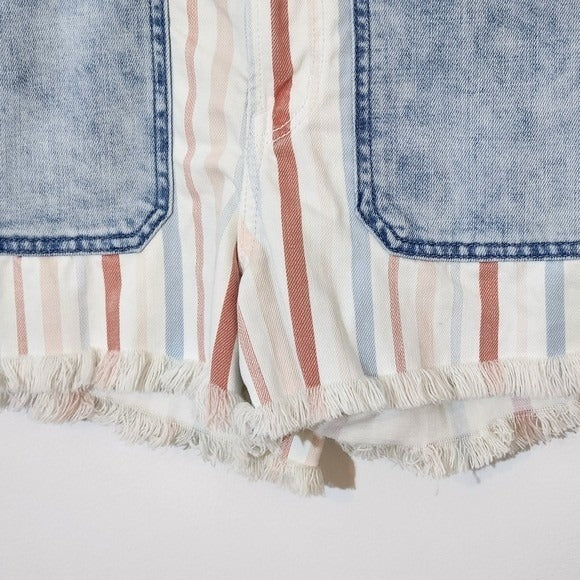 American Eagle women's shorts featuring a striped design with blue denim pockets. Button and zipper closure.