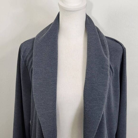 AnyBody knit open front jacket. Features tunneled waist drawcord with stoppers, long sleeves, and pockets. Color is a washed gray-blue color called Blue Night. Great condition!