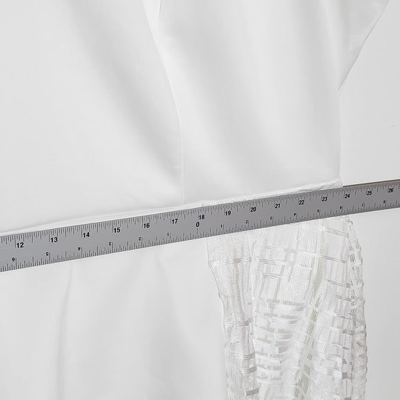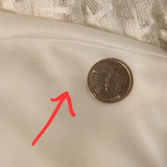 Bold, dramatic, and truly unique, this Ashley Stewart white peplum top features a stunning attached mini train that instantly elevates the look. The short sleeves and structured peplum silhouette create a flattering shape, while the attached piece has subtle metallic accents that add an eye-catching, elegant touch, making it perfect for bridal events, special occasions, or statement styling. There is a spot present, shown in images, and not treated due to tags.