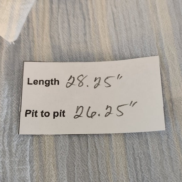 Ava & Viv light blue and cream stripe button-up shirt with sheer fabric, cuffed sleeves, 100% cotton material, and a crinkly texture.