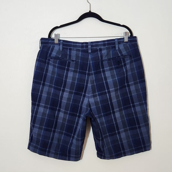 Banana Republic blue plaid shorts with pockets and button/zipper closure. This has a slightly uneven shade in some areas.