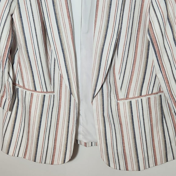 This Bar III blazer serves up chic tailoring with a playful twist. Made from a linen and cotton blend with subtle texture, it features 3/4 sleeves and a fully lined interior for a polished, easygoing fit. Open front with no buttons. The striped pattern blends pink, black, and tan against an off white background, giving it that modern standout vibe without trying too hard. Pre-loved and in great condition.