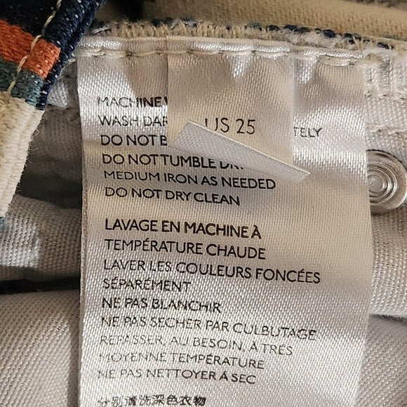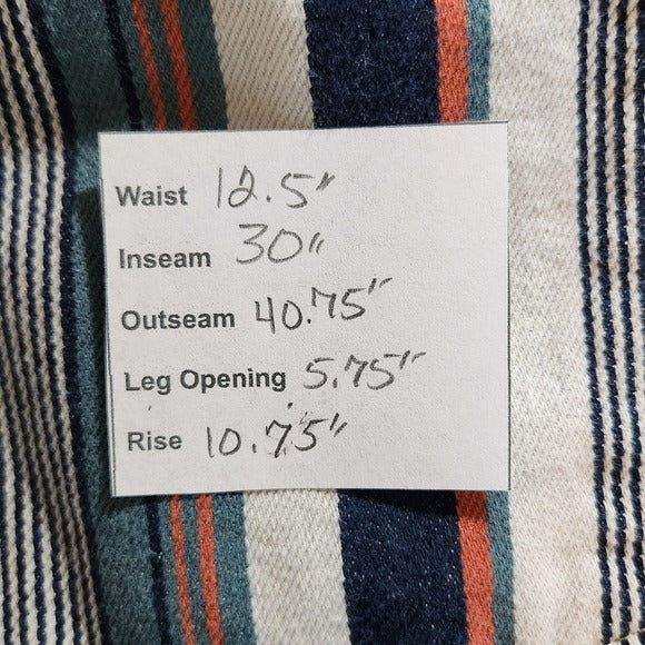 BDG blue and orange striped jeans with high-rise tapered style and button/zipper closure.