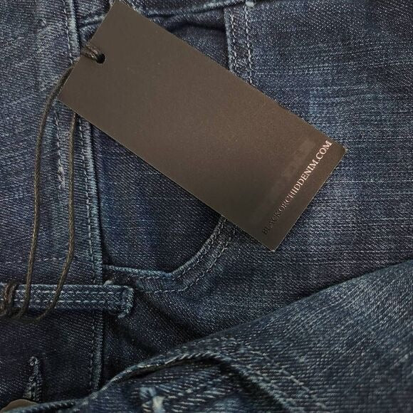 Black Orchid dark wash boot cut jeans. Feature button and zipper closure and pockets.