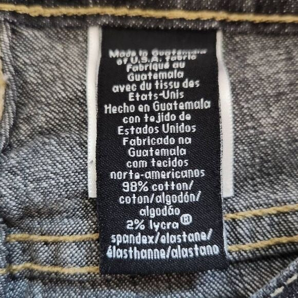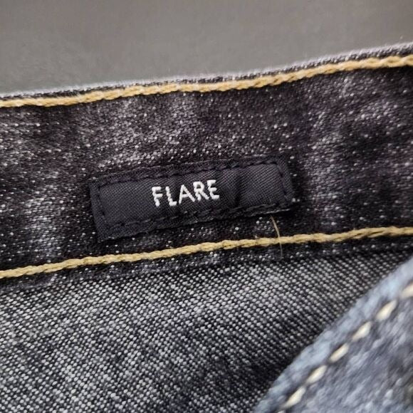 Calvin Klein boot cut jeans. Feature pockets in front and back. Zipper and button closure. Black fabric has a faded look with factory fading, especially on the rear and thigh area. Also has distressing on pocket edges and hemline. Great condition!