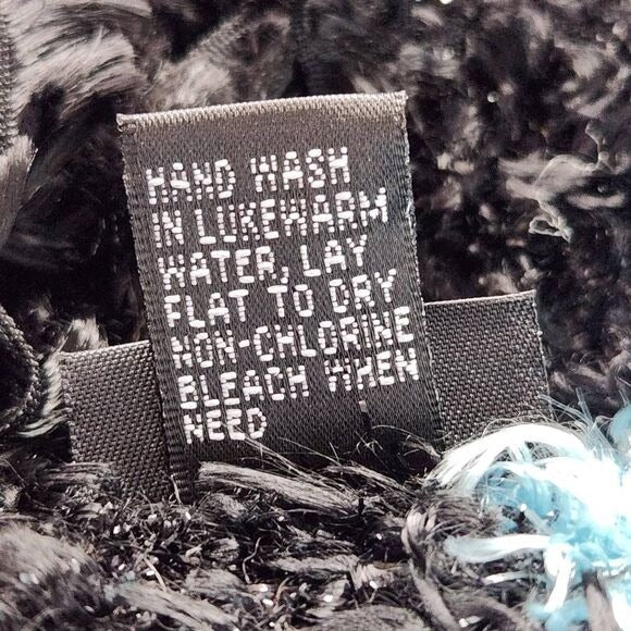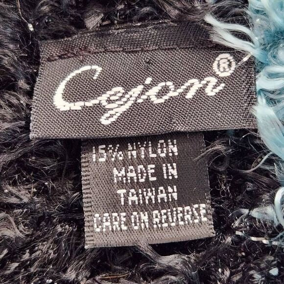 Cejon striped scarf with black, blue, purple, green, and gray with metallic accents.