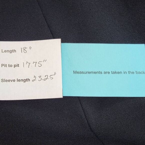 Chico's long-sleeved black blazer with open styling and knit fabric. Lined. Slightly cropped fit. Size is a Chico's Size 0, which is a small 4/6 per their size chart.