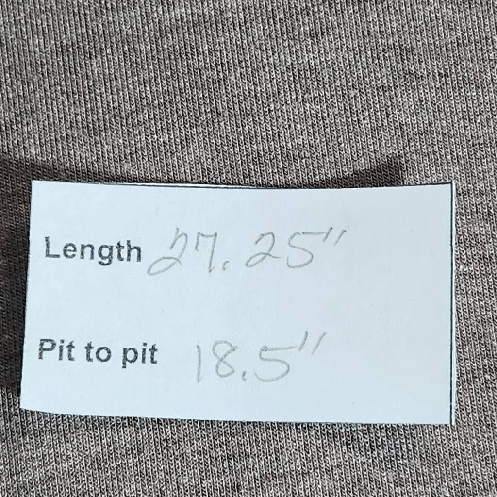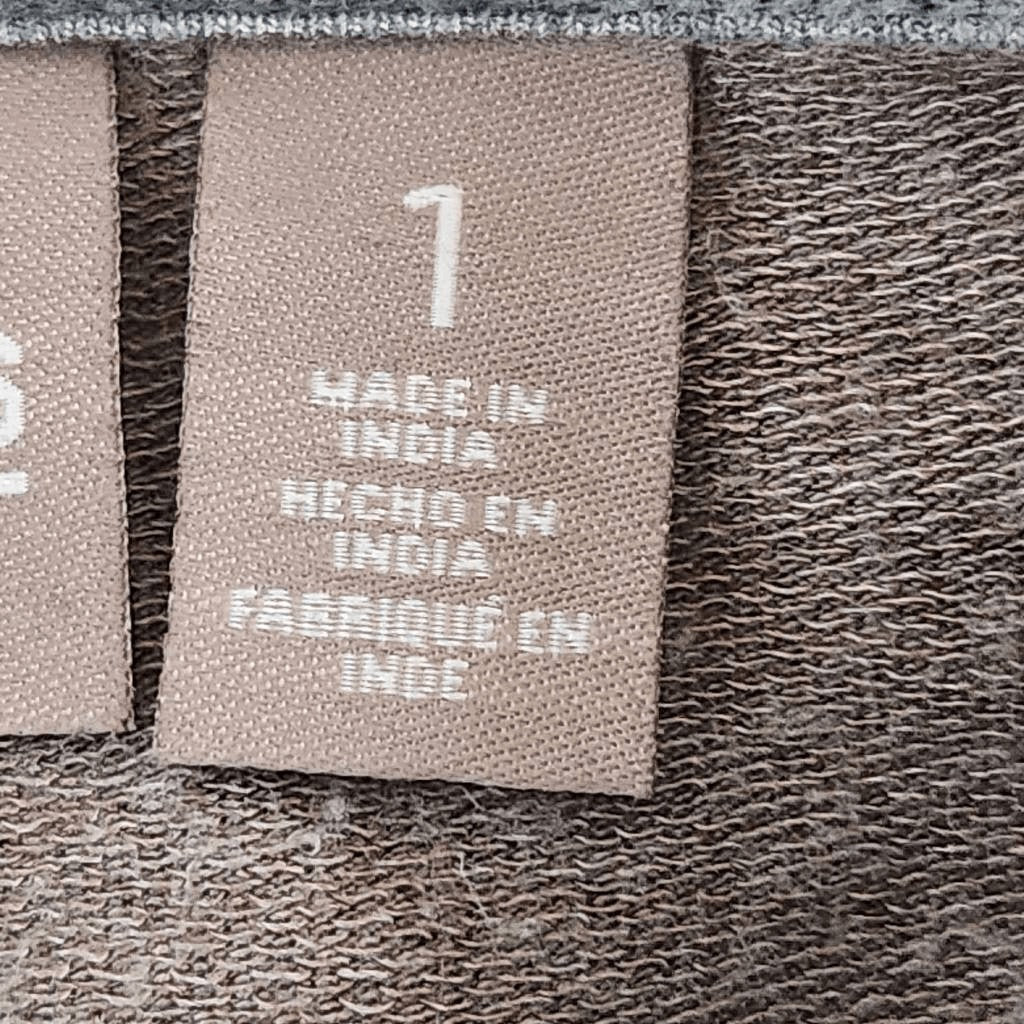 Chico's cowl neck knit top in tan, gray, and black with a layered look at the hem. This is a Size 1 which is a Medium 8 per Chico's sizing.