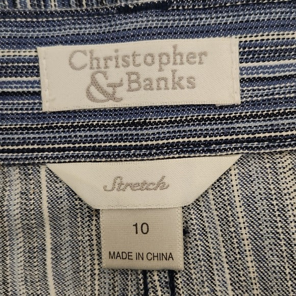 This Christopher & Banks skirt features a knee-length A-line silhouette with a striped denim pattern in varying shades of blue. The fabric has some stretch for comfort, and the combination of stripes and shape creates a flattering, stylish look. A versatile piece that pairs well with both casual and polished tops.