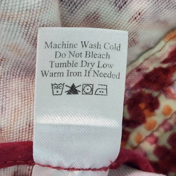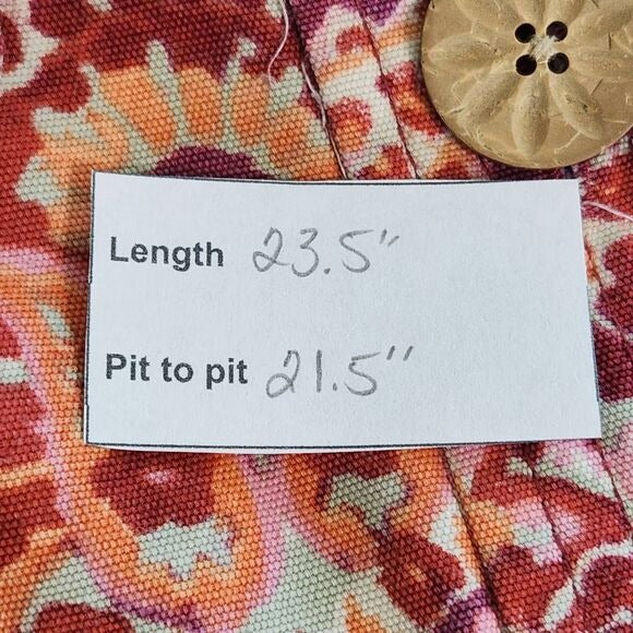 Coldwater Creek jacket features faux pockets, 100% cotton fabric, and a colorful print with shades of red, pink, and orange.