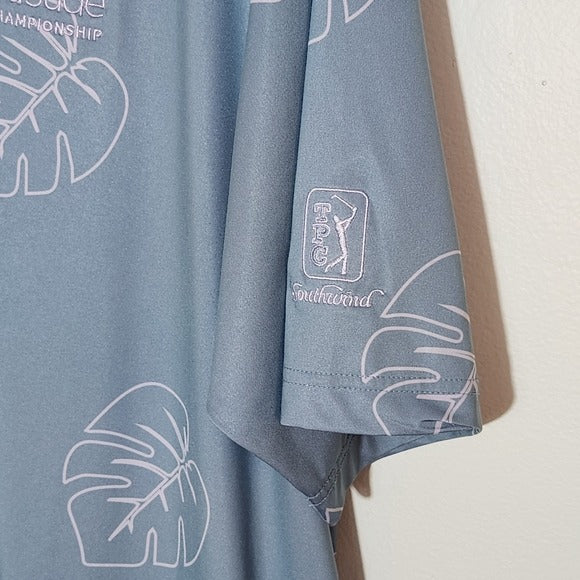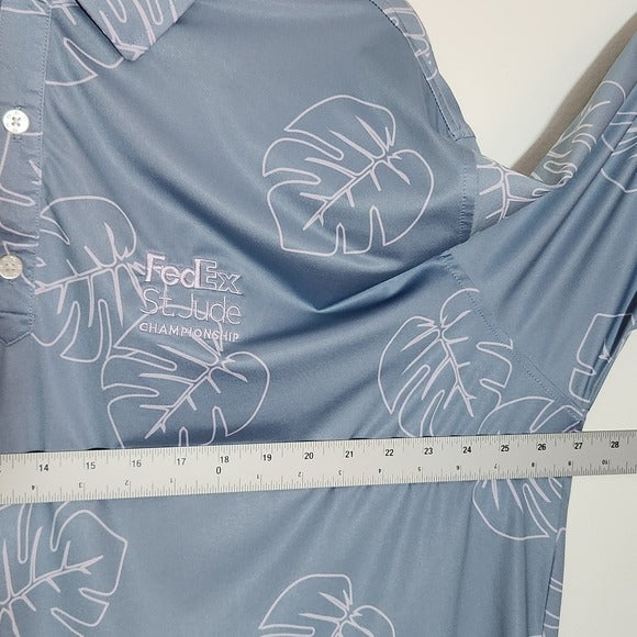 A stylish performance golf polo in a light blue shade with a greyish-purple palm print that adds a fun yet refined look on and off the course. Features the FedEx St. Jude Championship logo on the chest and the TPC Southwind logo on the sleeve for a sporty, tournament-ready touch. Lightweight and breathable with a classic short sleeve design, perfect for golf, casual wear, or athleisure styling.