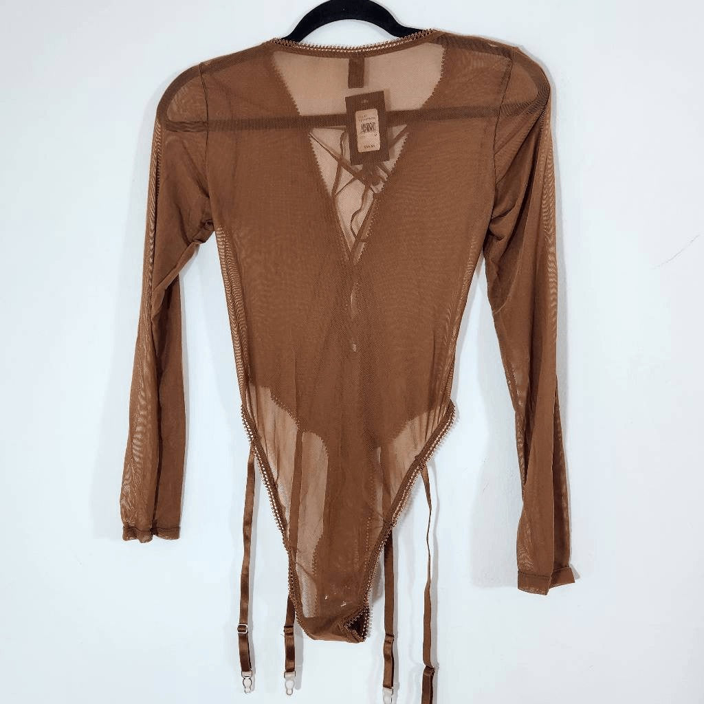 Frederick's of Hollywood cocoa brown long-sleeve mesh bodysuit with sexy lace-up front.