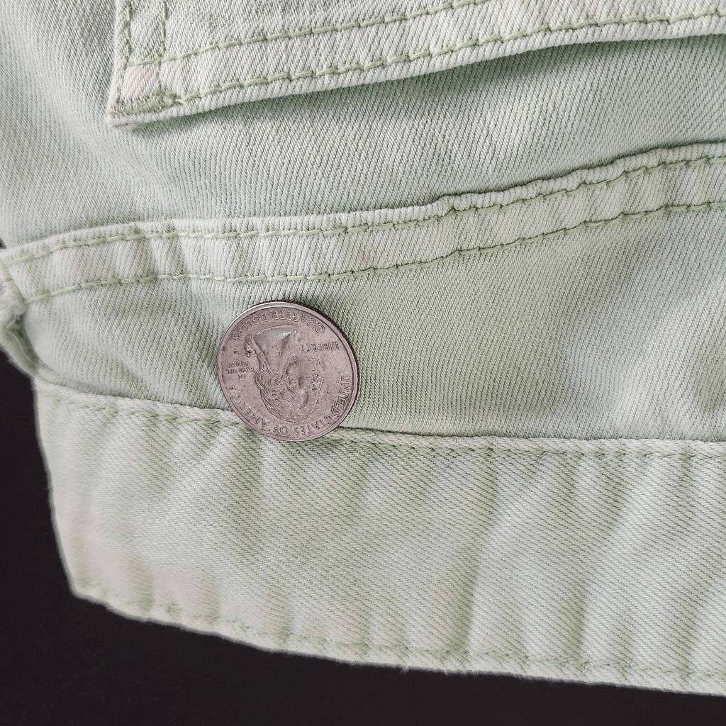 Free People mint green skinny jeans with ankle zip detail.