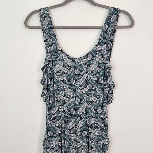 Fresha London sleeveless jumpsuit with flowy legs and ruffle detail. Cropped jumpsuit features pockets, a back zipper with hook/eye closure, and a cute backless style. Fabric is a palm leaf pattern and has texture. Great condition!