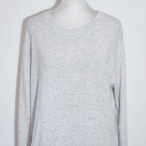 Green Tea light gray sweatshirt with notches on the side, a slightly longer hem in the back, and a kangaroo pocket.