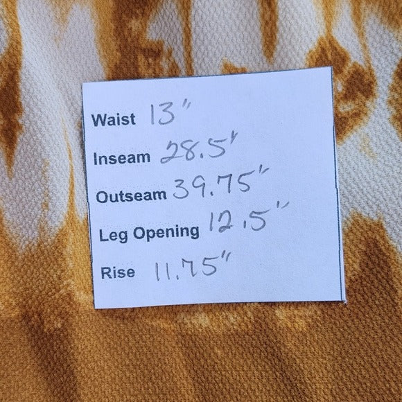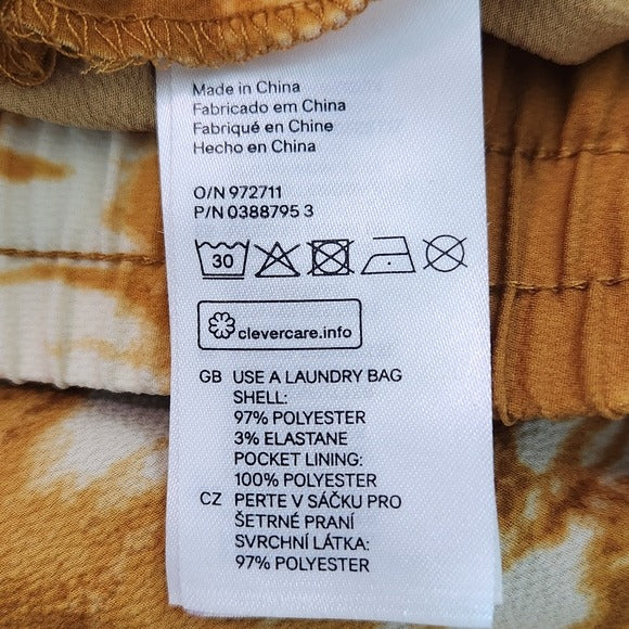 H&M wide-leg pants with a yellow and cream Ikat tie-dye pattern. Pull-on style with elastic waist, tie, and pockets.