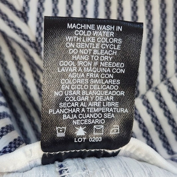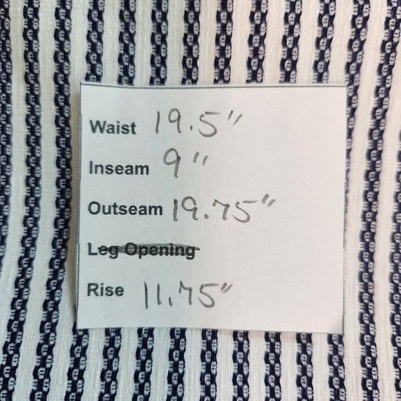 Hilary Radley navy stripe pull-on shorts with stretchy fabric, faux back pockets, and pockets in the front.