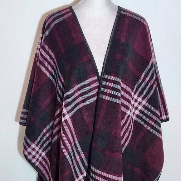 Stay cozy and stylish with this Ike Behar burgundy and black plaid wrap featuring a soft fleece lining and warm, comfortable fabric. Perfect for layering on cool days or adding a touch of timeless plaid charm to your look. Measures approximately 44 inches wide by 31 inches long.