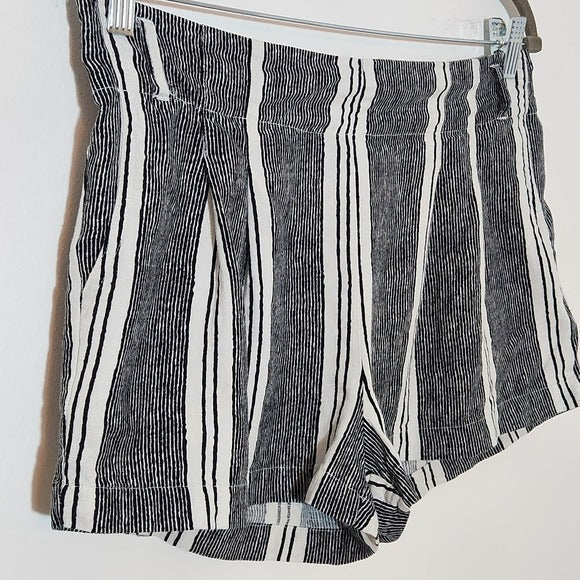 Indigo Rising black and white striped shorts with pull-on style, elastic at the waist, and a linen-cotton blend fabric.