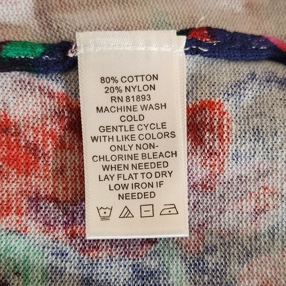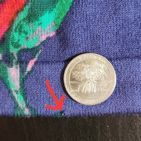 Isaac Mizrahi vibrant floral button-up cardigan sweater with a navy background. This is NWOT and still has a button bag attached, but there is a tiny flaw near the hemline (almost where a hole was starting to form).