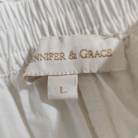 Jennifer & Grace white long skirt with embroidered circle detail, pockets, lining, elastic waist, and 100% cotton fabric.