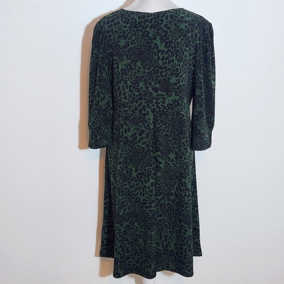 Lark & Ro green leopard print dress with v-neck style and elbow length sleeves. Falls above the knee.