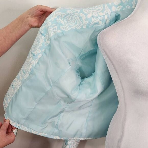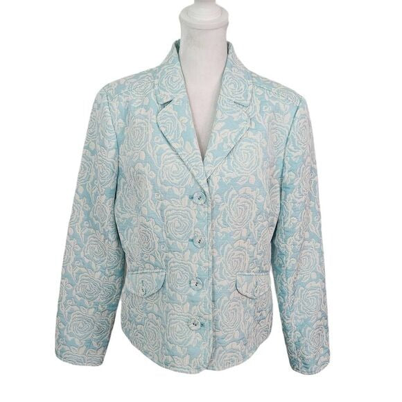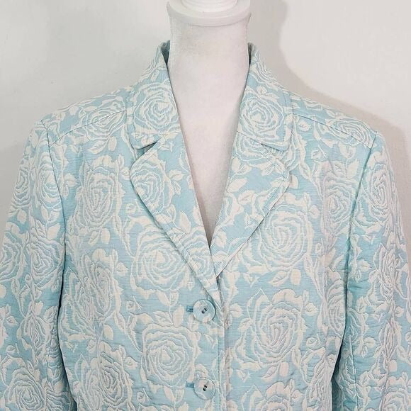 Villager by Liz Claiborne long sleeve blazer in white and light aqua blue. Features pockets, four buttons, and a brocade-like fabric with a rose print. Size is 12. Fully lined. Great condition!
