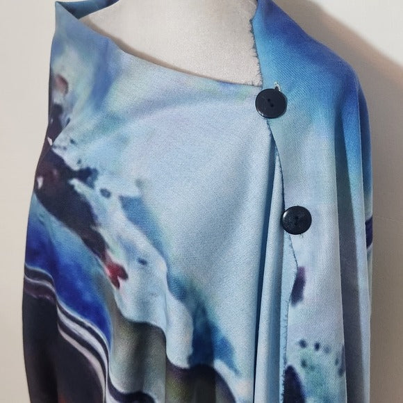 Magix Scarf elegant shawl featuring an abstract watercolor sunset design. Includes fringe detailing and buttons. Perfect for adding a splash of color to any outfit.