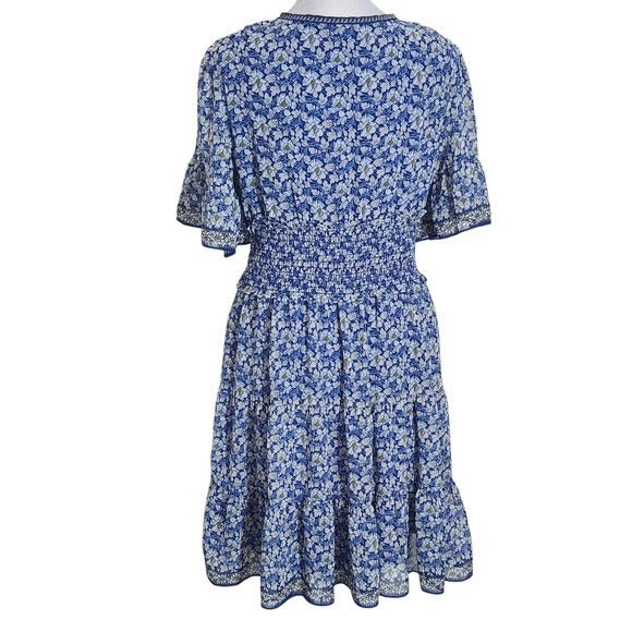Max Studio floral blue dress with a flattering fit, lining, and smocked waist.