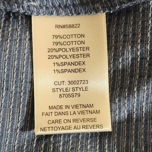 Max Studio blue striped top with a notch at the hem, slightly longer hem in the back, and full short sleeves.