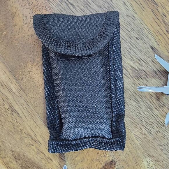 Multi-tool on keychain with 6 items, including pliers, can opener, Phillips head screwdriver, scissors, flat-head screwdriver/bottle opener, and file. Silver-tone metal. Includes a black case with velcro closure that can be attached to a belt. Also, the multi-tool is still wrapped in a plastic bag.