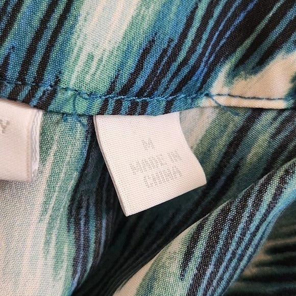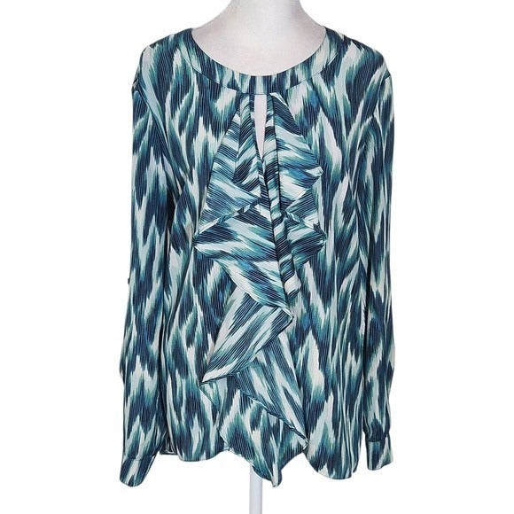 New York & Company Blue and Green Print Blouse Size Medium Ruffle Neck Top