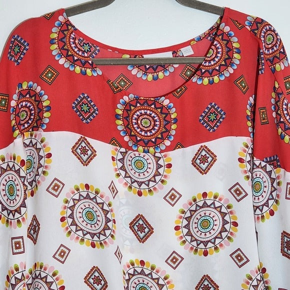 A lightweight sheer blouse with a vibrant multi-color print featuring red and white tones that add a bold yet polished touch. The 3/4 sleeves and airy fabric give it an effortless, flowy feel that works beautifully for office wear, layering, or chic everyday outfits. Stylish, versatile, and easy to dress up or down with trousers, denim, or skirts.