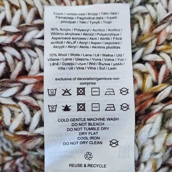 Noisy May multicolor knit turtleneck sweater vest in a chunky knit fabric. Fuzzy texture with some wool in the material. Color is cream with autumn shades like brown, rust, gold, and green.