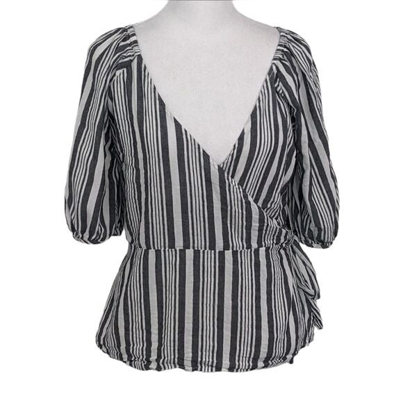 Old Navy Black and White Striped Wrap Blouse Size Small Puffy Sleeve Top