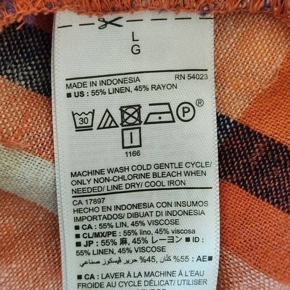Old Navy preppy plaid sleeveless dress with pockets and a mix of orange, navy, and white shades. Medium-weight linen blend fabric.