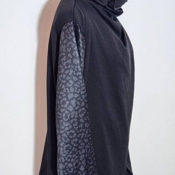 Pebble Beach women's black performance draped jacket with double shoulder snaps, pockets, and cute gray and black leopard print arms.