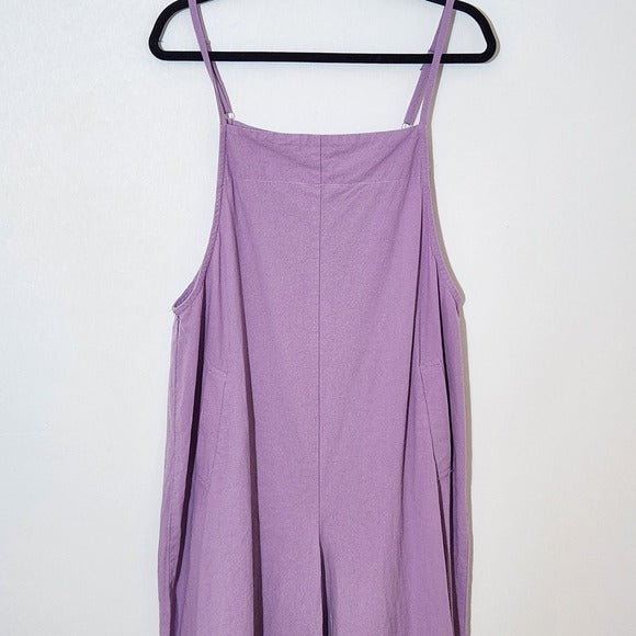 Stylish purple wide-leg overalls with a cropped style, adjustable straps, pockets, and notches at the hem.
