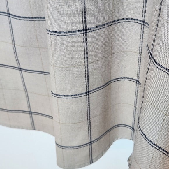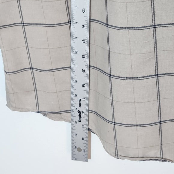 This St. John’s Bay men’s button-down shirt features a classic plaid pattern in light khaki with subtle touches of gray. Designed for a relaxed fit with long sleeves and a chest pocket, it’s an easy-care, iron-free shirt ideal for casual or office wear. There are some whitish spots on the back, but they are not noticeable when the shirt is tucked in.