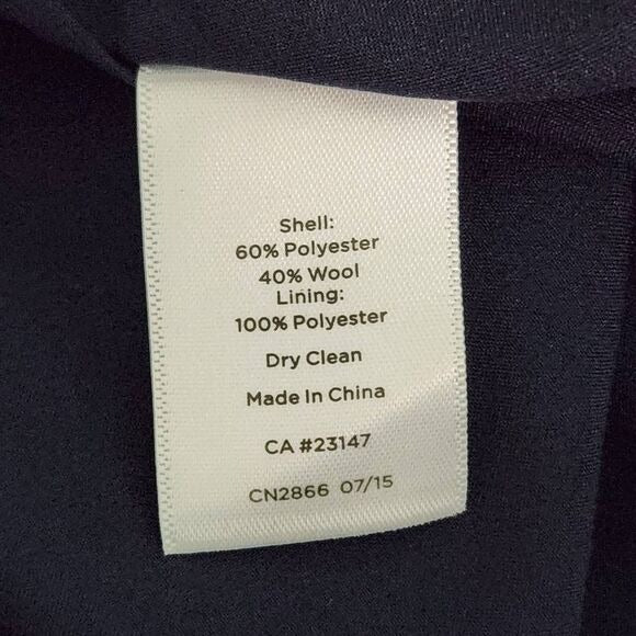 Talbots navy and red polka dot skirt with a wool blend fabric, side zipper, and pockets in the front. Falls above the knee.