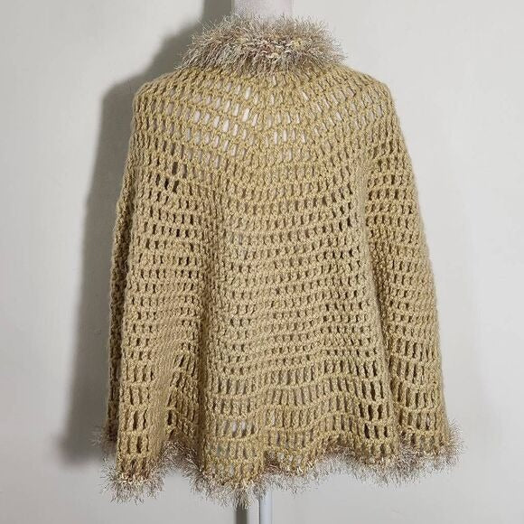 Tan Hand-Knitted Open Weave Cape with Oversized Button and Fuzzy Trim One Size