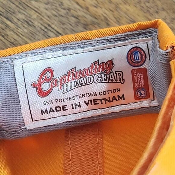 Captivating Headgear orange baseball cap with Vols logo. It features an embroidered logo on the front and an adjustable strap. Overall, it is in excellent condition. However, it has a discoloration on the bill—very light but shown in the images.