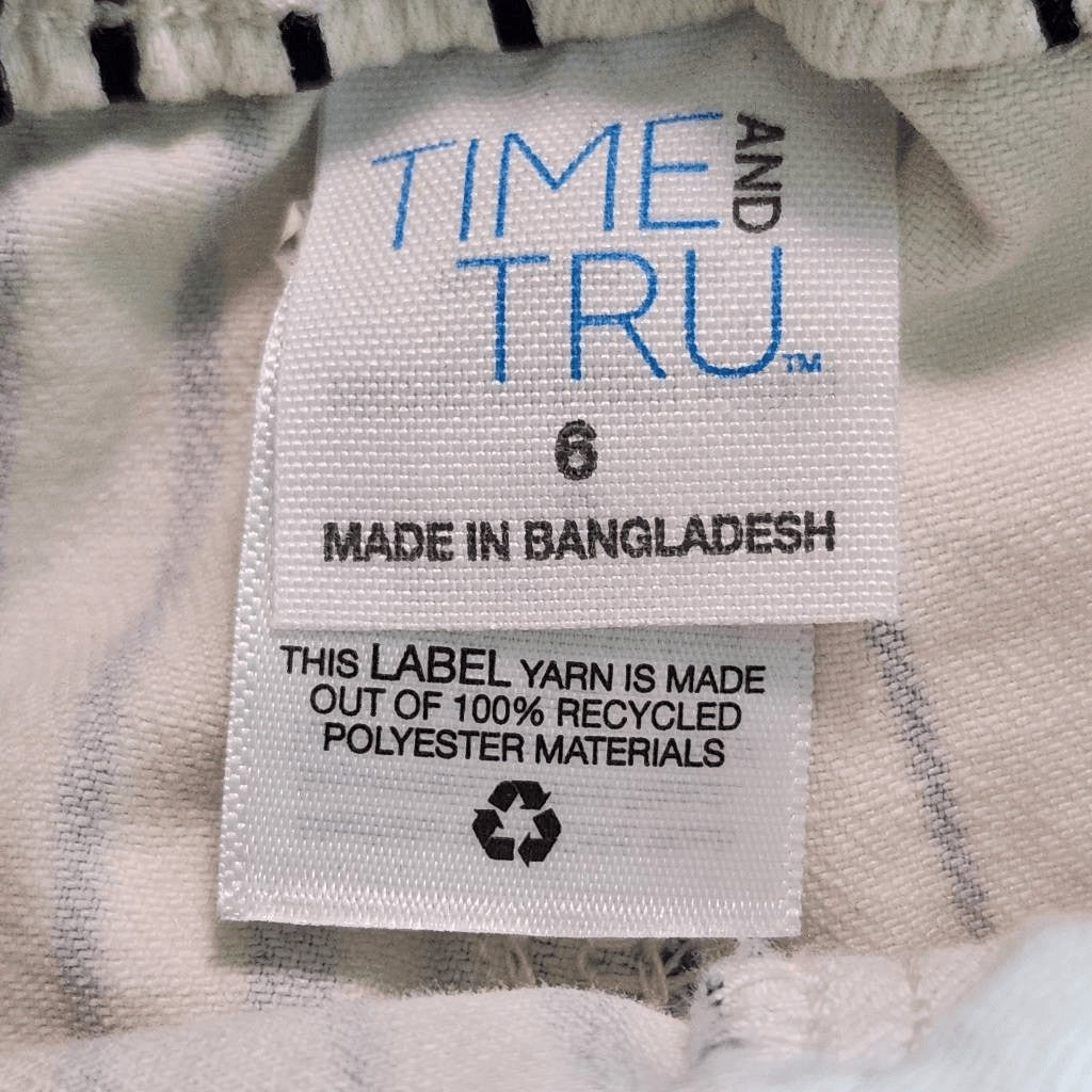 Time & Tru jean shorts with a navy and white stripe pattern, button and zipper closure, tie/elastic at waist, and pockets.