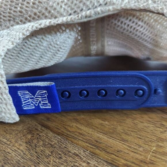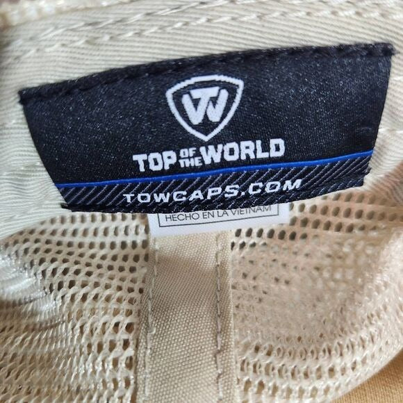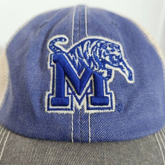Top of the World Memphis Tigers hat features an embroidered logo on the front and cream mesh trucker-style back. Plastic adjustable snap-style strap. Great condition.