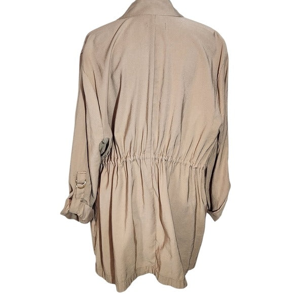 Torrid stylish and versatile tan open front jacket features pockets, roll-tab sleeves, and drawstring with toggles at the waist.