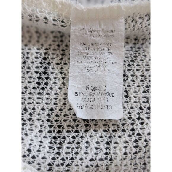 Vanilla Bay long sleeve open knit sweater features a round neck. Lightweight knit in mint green, ivory, and tan. Great condition!