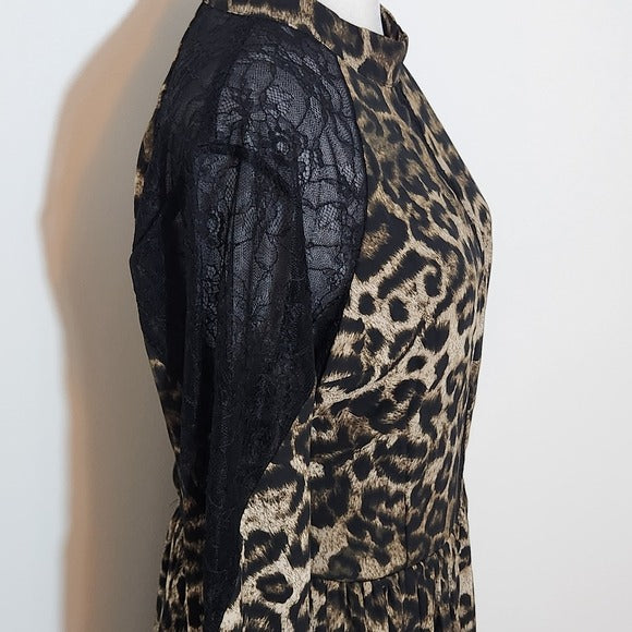 Venus Black Leopard Print Midi Dress with Lace Accents NWOT Size 12